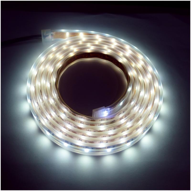 - Одноцветные. Данный тип лед-полосок может светить только конкретным оттенком – в соответствующем заявленному производителем сегменте спектра – от 2700 до 6000 К, причем самым ярким считается световой поток белого света. Для придания характерного оттенка применяется соответствующее окрашивание изначально прозрачного лэд-элемента.